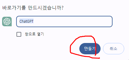 gpt 창 띄워놓고 세로 점3개 클릭 ➡ 저장 및 공유 ➡ 바로가기 만들기 ➡ 만들기